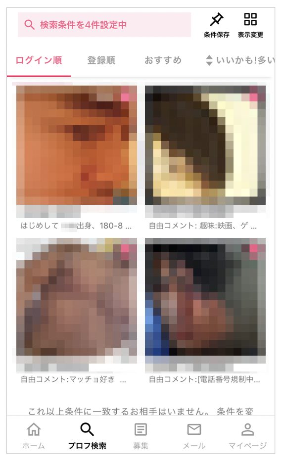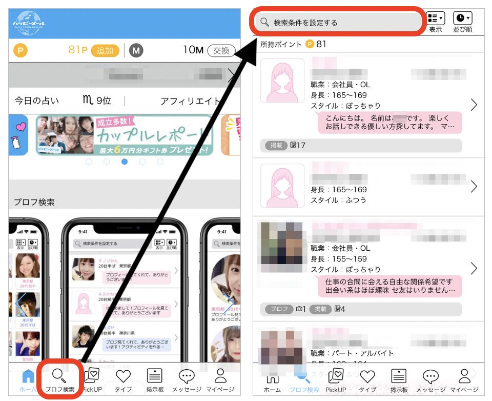 ハッピーメールのトップページにアクセスし、トップページの『プロフ検索』をタップし、次の画面で『検索条件を設定する』をタップします。