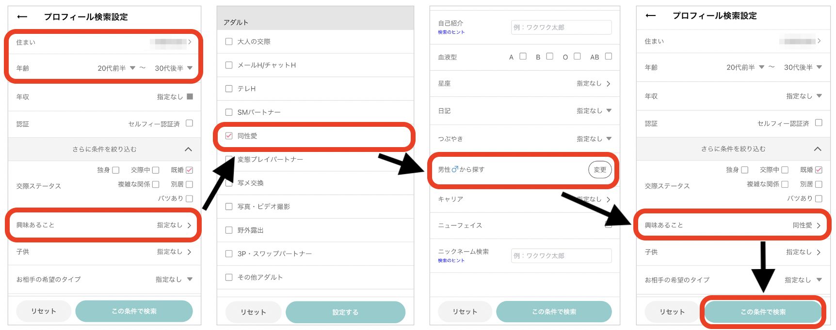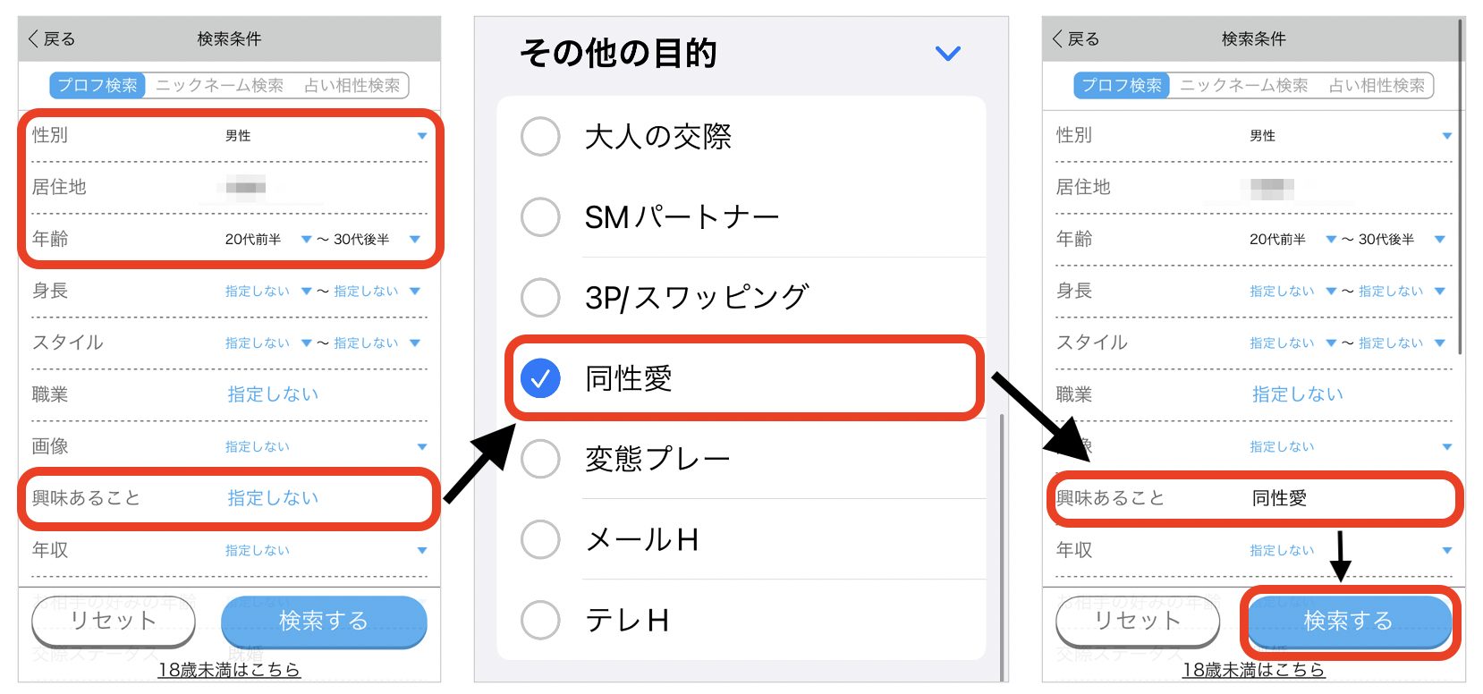 ここで検索条件を、性別『男性』、居住地、年齢『20代前半〜30代後半』を指定し、興味のあることで『同性愛』を指定します。