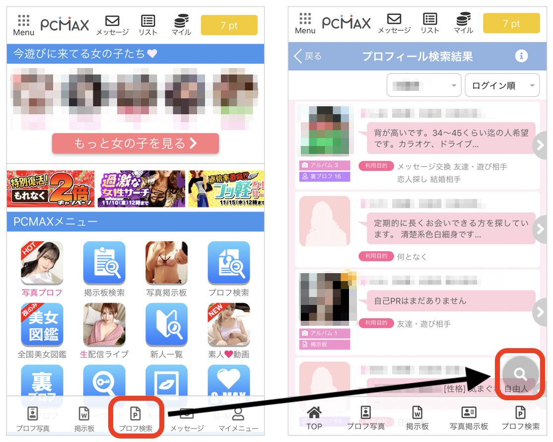 PCMAXのトップページにアクセスし、トップページの『プロフ検索』をタップし、次の画面で『検索マーク』をタップします。