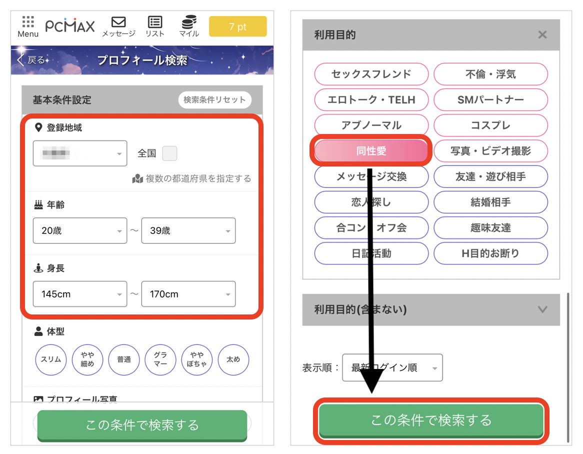 ここで検索条件に、登録地域、年齢『20歳〜39歳』、身長『145cm〜170cm』を指定し、利用目的で『同性愛』を指定します。