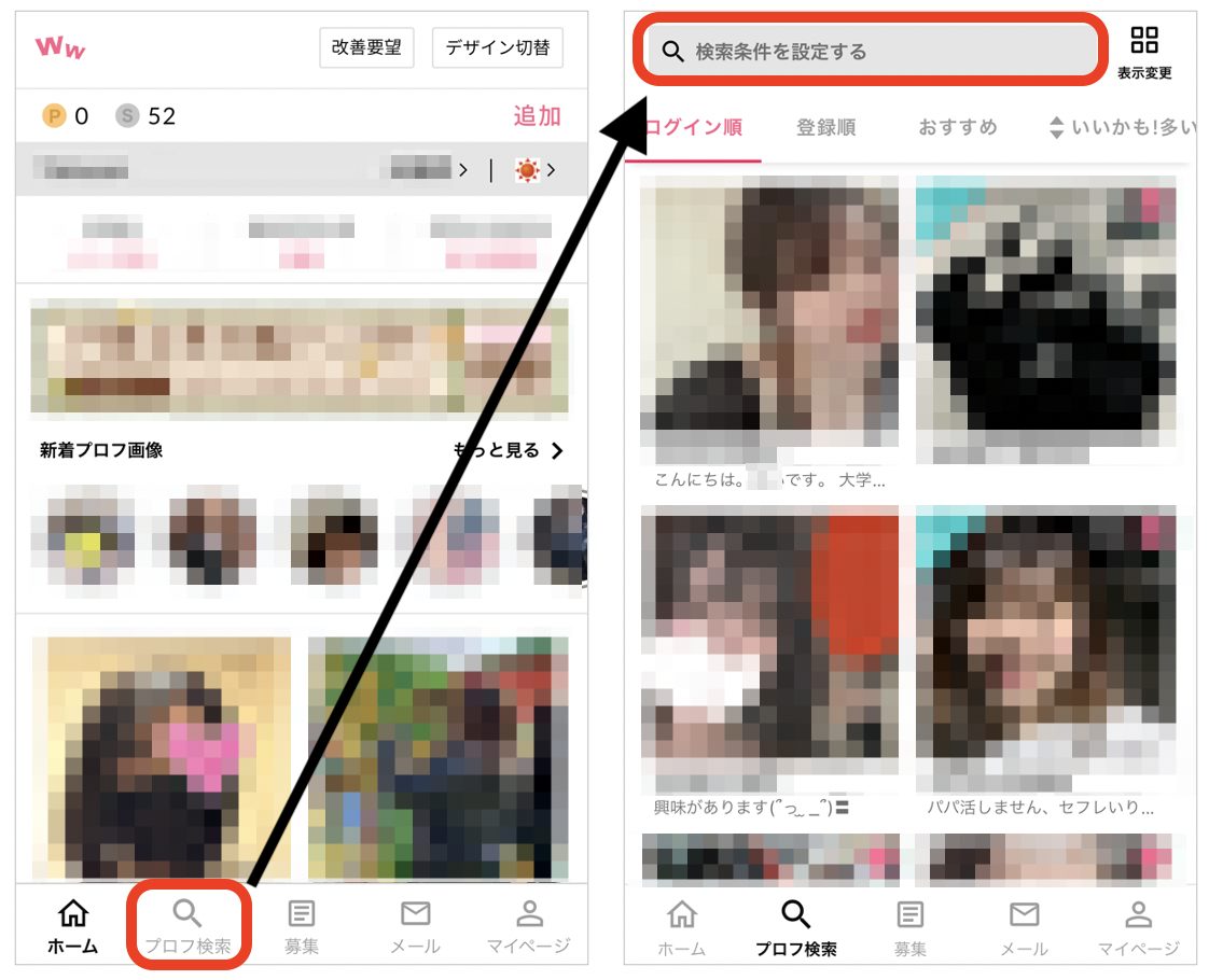 ワクワクメールのトップページにアクセスし、トップページの『プロフ検索』をタップし、次の画面で『検索条件を設定する』をタップします。