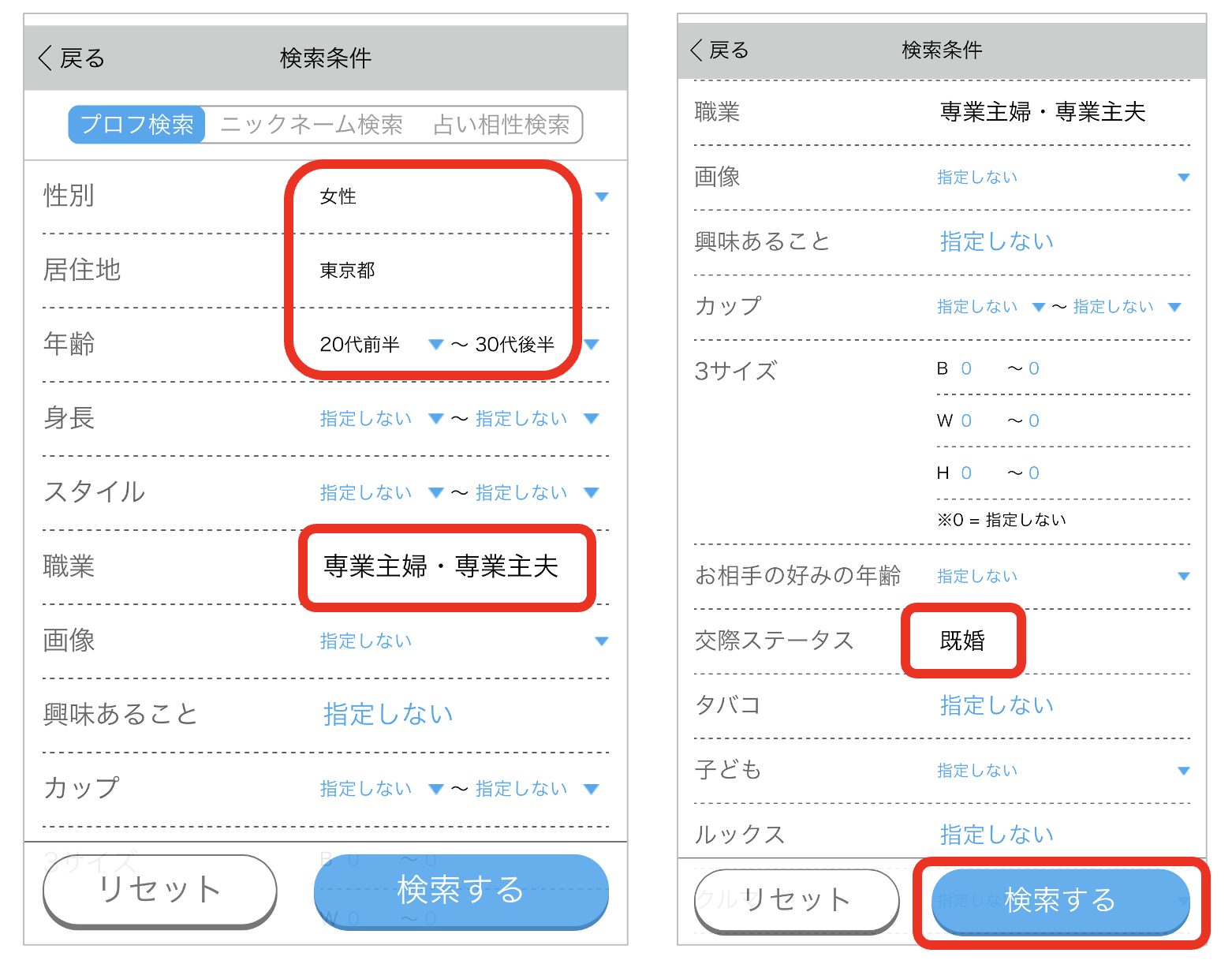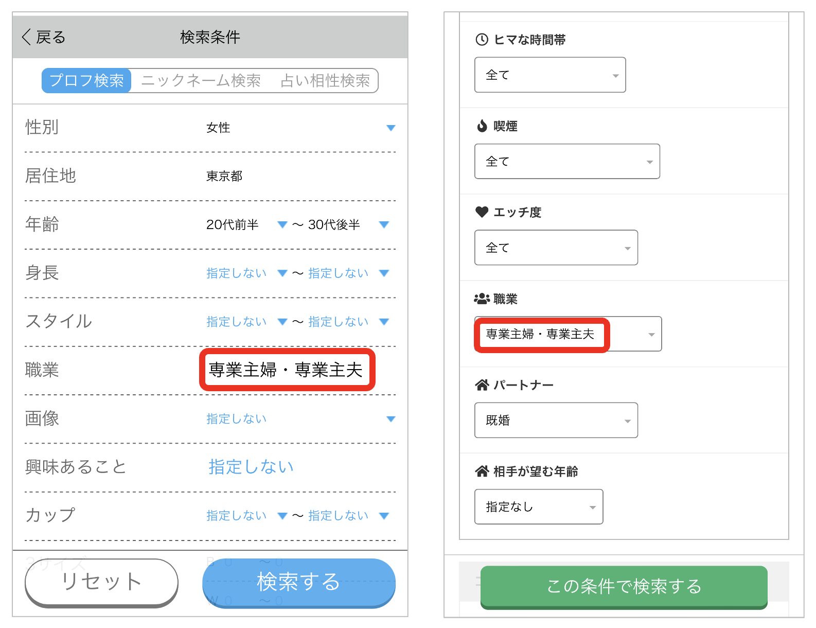 既婚者でも利用できる大手のマッチングアプりでは、検索の機能の中に、『専業主婦』を絞り込んで検索できる機能が標準装備されているサービスがほとんどです。