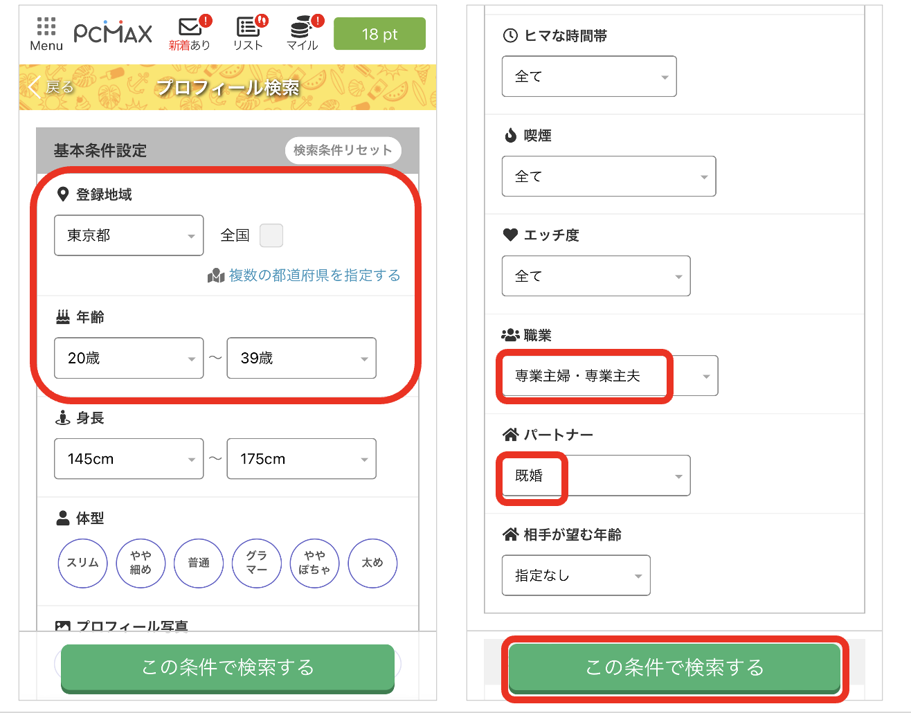 PCMAXのプロフ検索画面で、同じ条件で登録地域(東京都)、年齢(20歳〜39歳)、職業(専業主婦)、パートナー(既婚)の条件のみを選択して検索してみました。