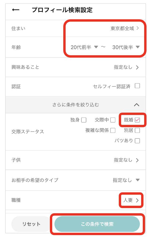 ワクワクメールには、職業の絞り込みに『専業主婦』がないので、その代わりとして『人妻』を選択しました。