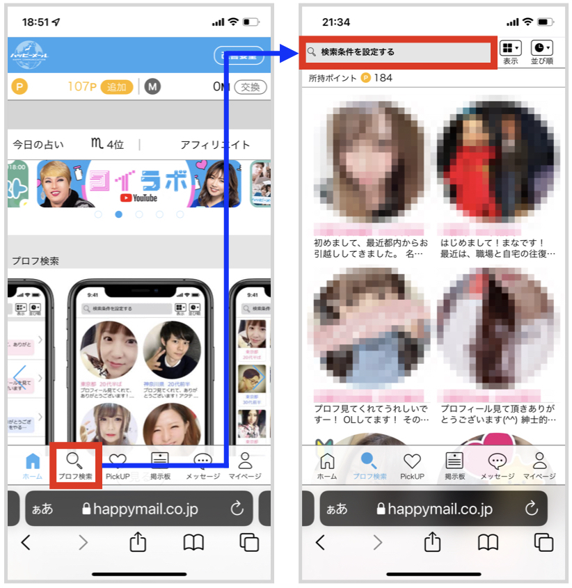 大手のマッチングアプリでは、掲示板検索とプロフ検索の2種の検索機能があるところがほとんどです。