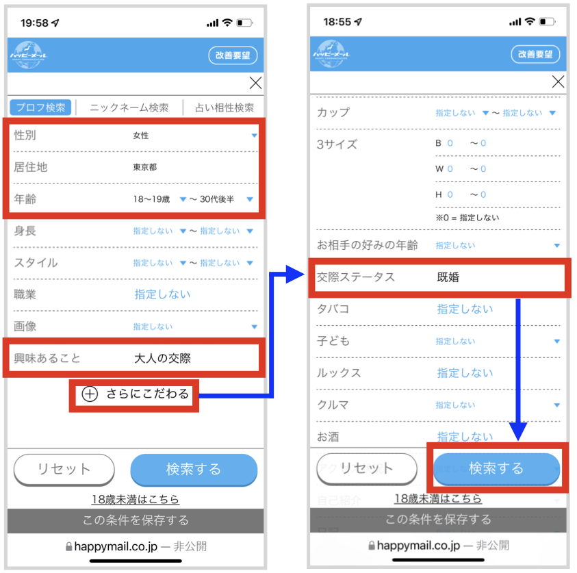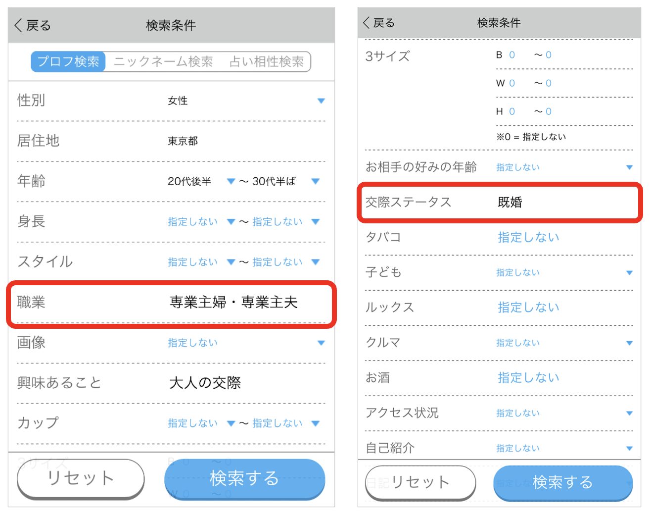 例えば、下記のように、検索画面で相手の職業が『専業主婦』であったり、交際ステータスが『既婚』などが選べるような、既婚者向けの機能が充実しているマッチングアプリを選びましょう。