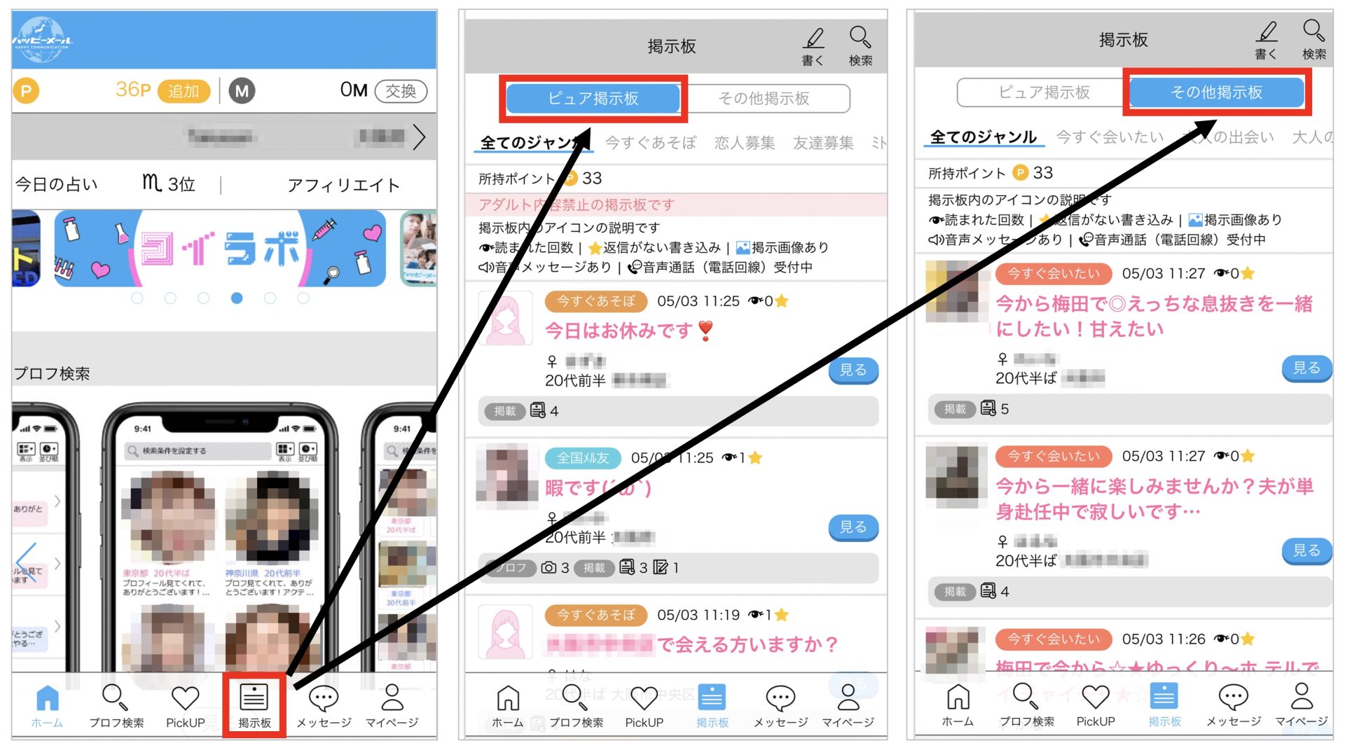 掲示板検索では、掲示板にメッセージをアップした順に表示され、積極的に出会いを求めている利用者が多いので、今すぐ出会いたい相手を探すのにおすすめの機能です。