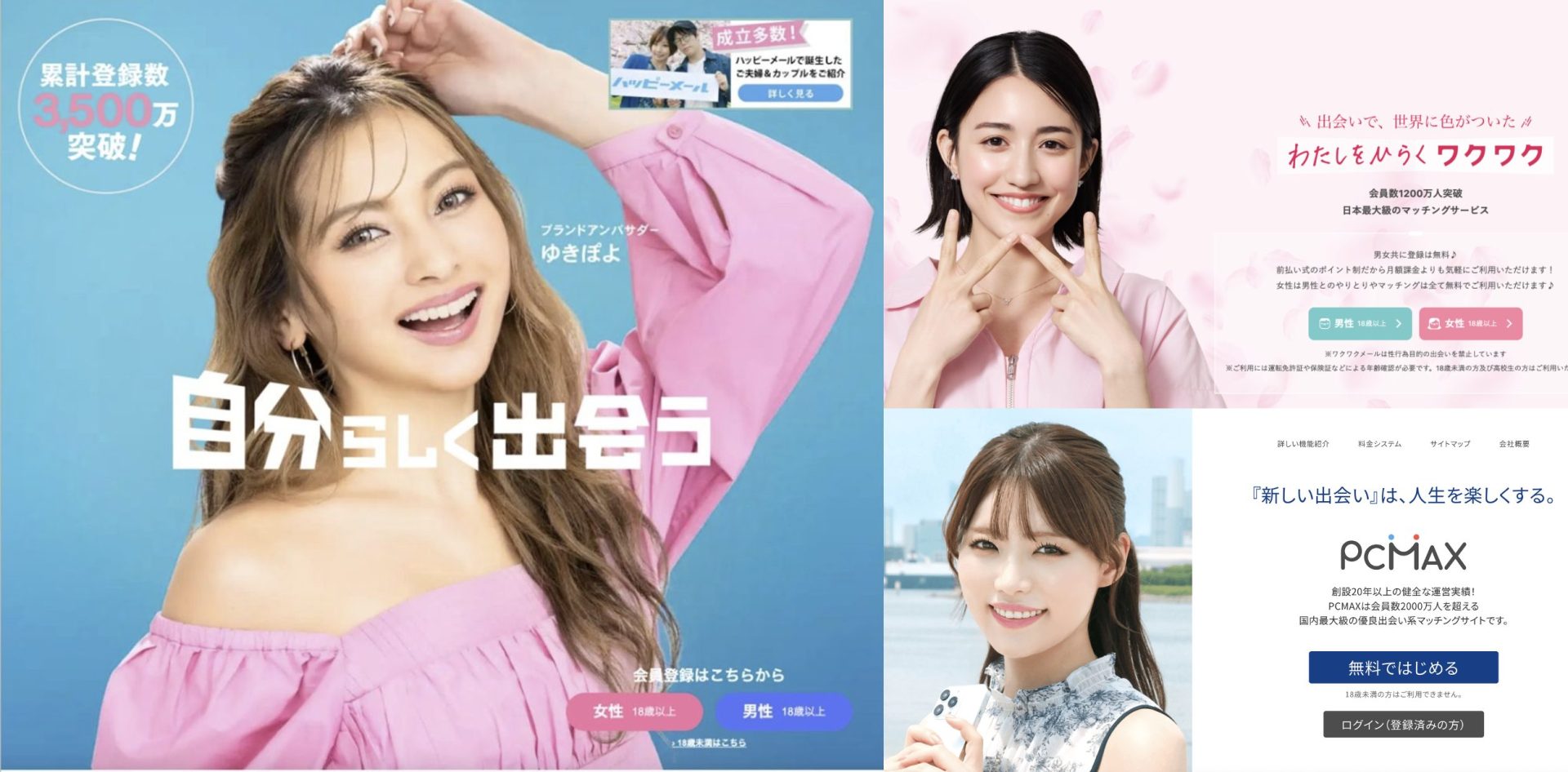 ちなみに大手マッチングアプリの会員数は、ハッピーメール(3,500万人)、PCMAX(2,000万人)、ワクワクメール(1,300万人)です(2026年1月現在)。