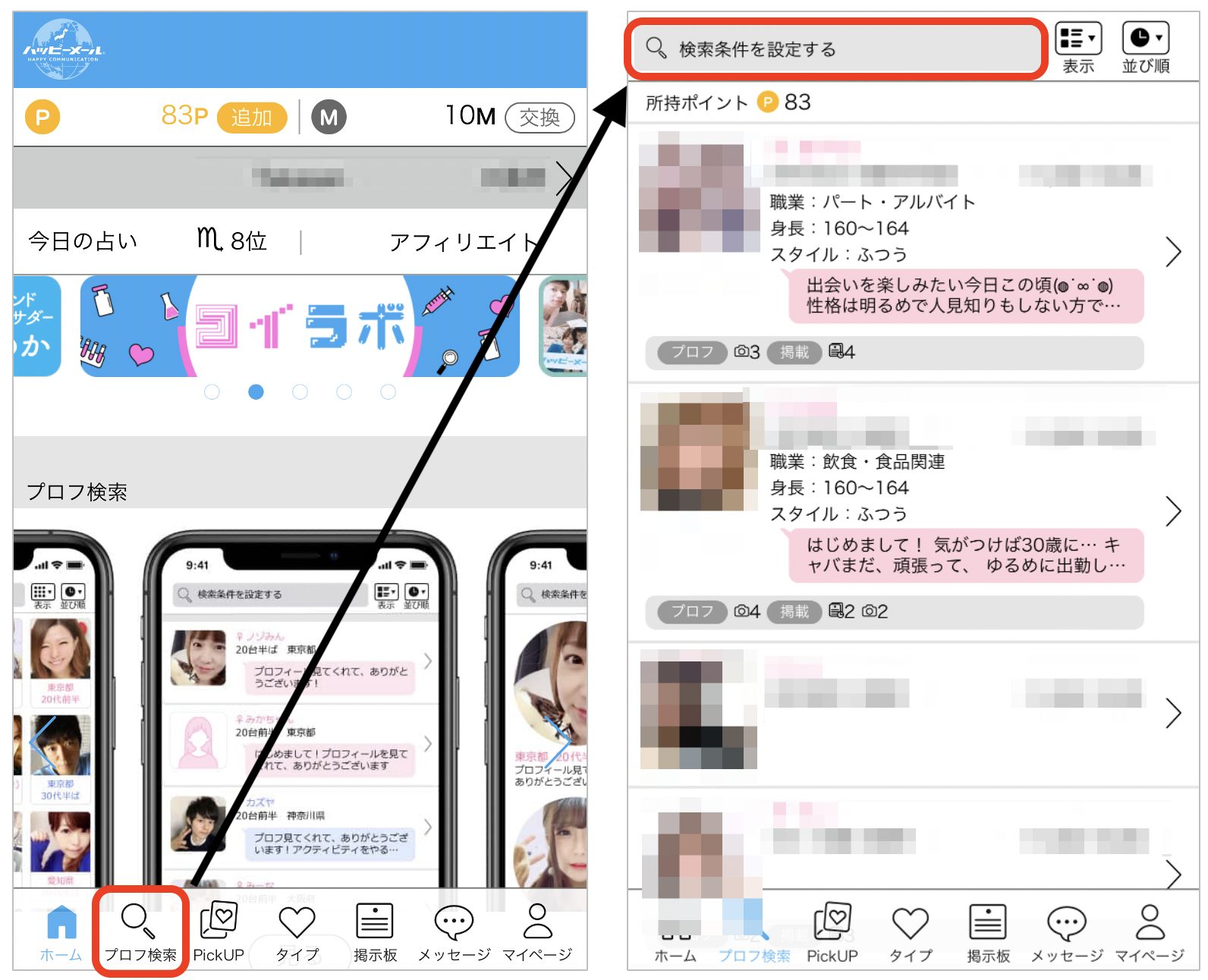 ハッピーメールのトップページにアクセスし、トップページの『プロフ検索』をタップし、次の画面で『検索条件を設定する』をタップします。