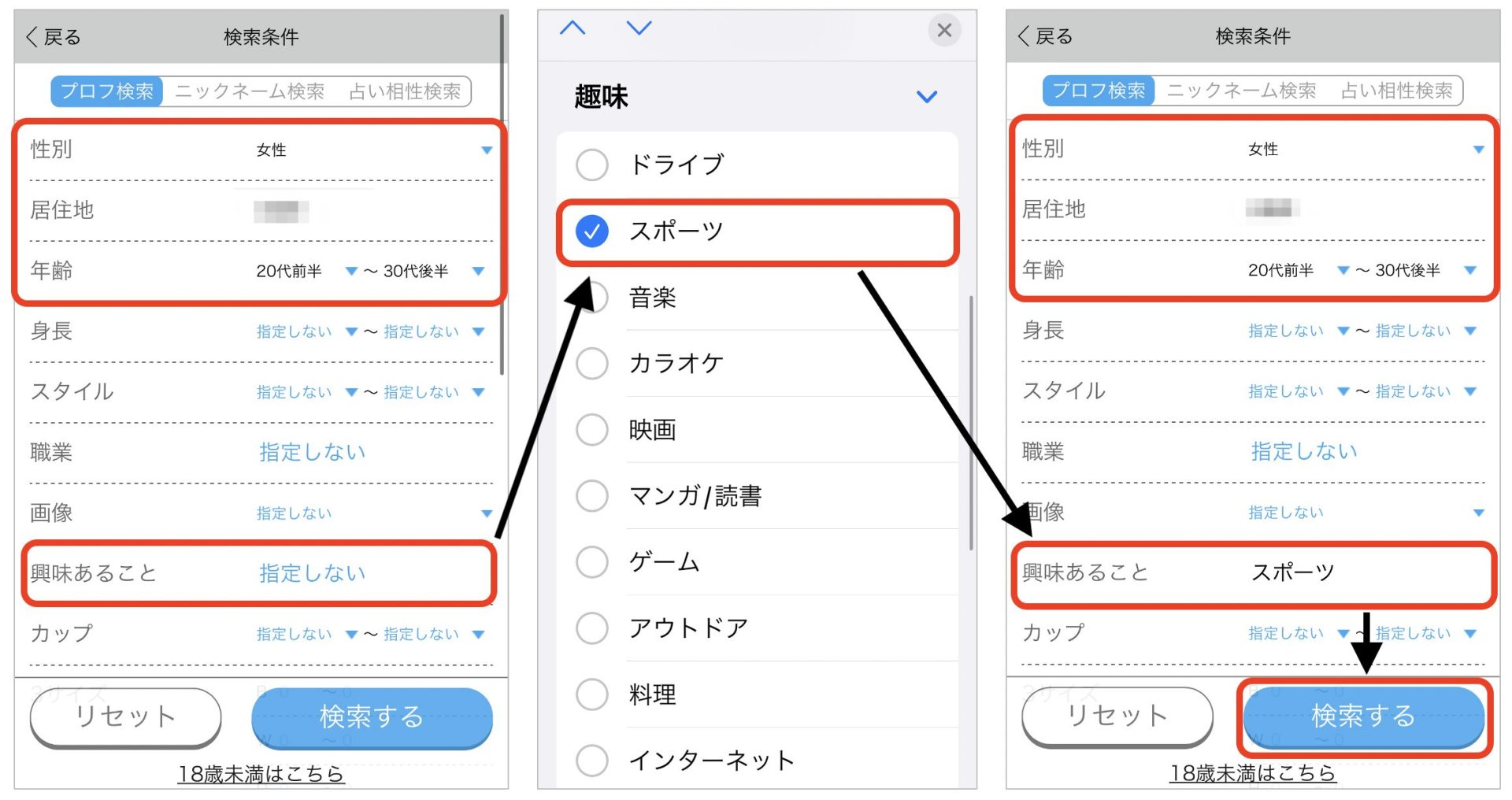 ここで検索条件を、性別『女性』、居住地、年齢『20代前半〜30代後半』を指定し、興味のあることで『スポーツ』を指定します。