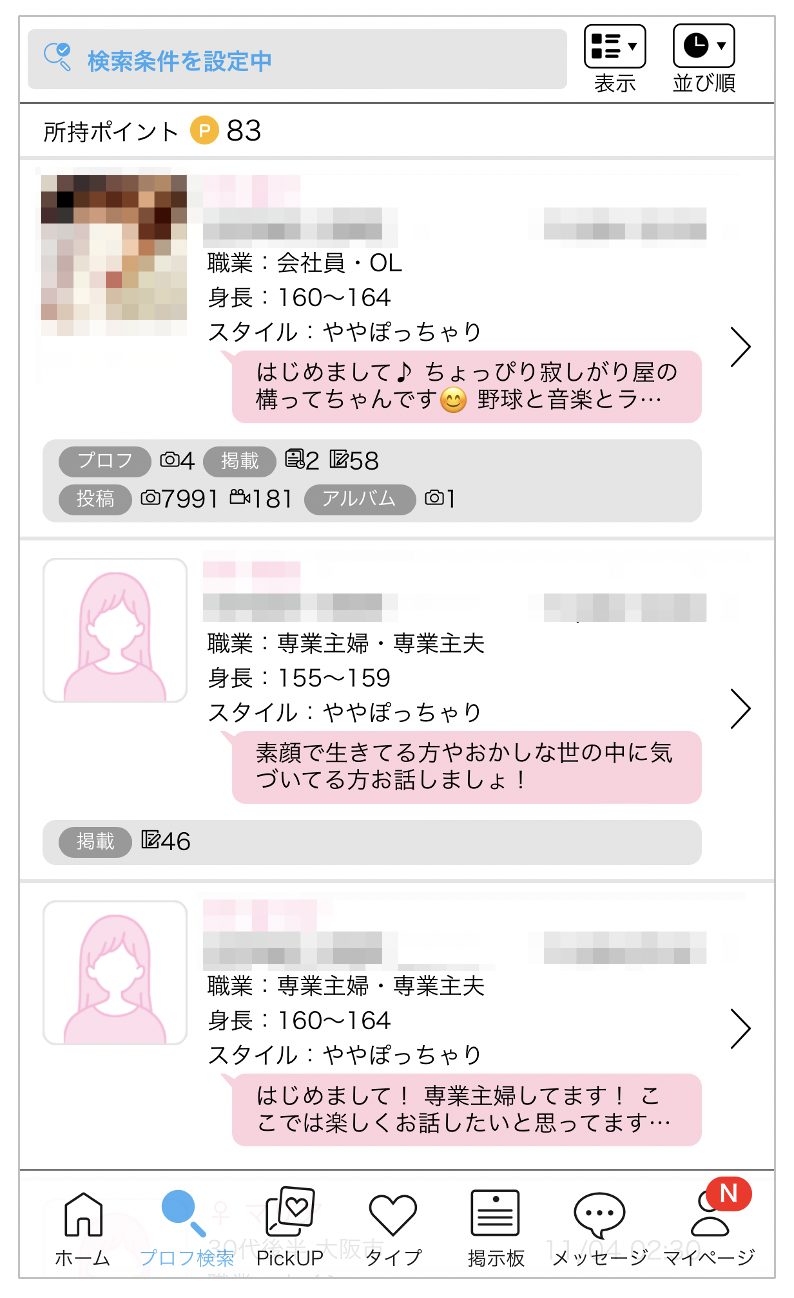 そうするとあなたの指定した条件で『スポーツを一緒にしたり観戦したい友達』を探している女性の候補がズラッと出てきます。