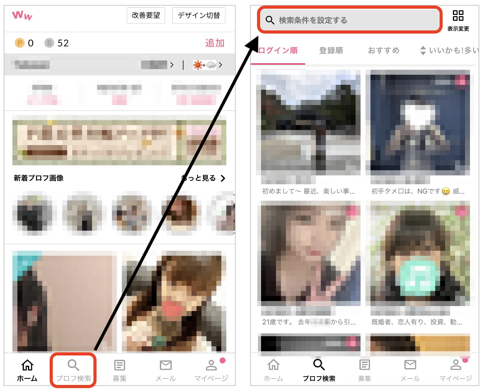 ワクワクメールのトップページにアクセスし、トップページの『プロフ検索』をタップし、次の画面で『検索条件を設定する』をタップします。