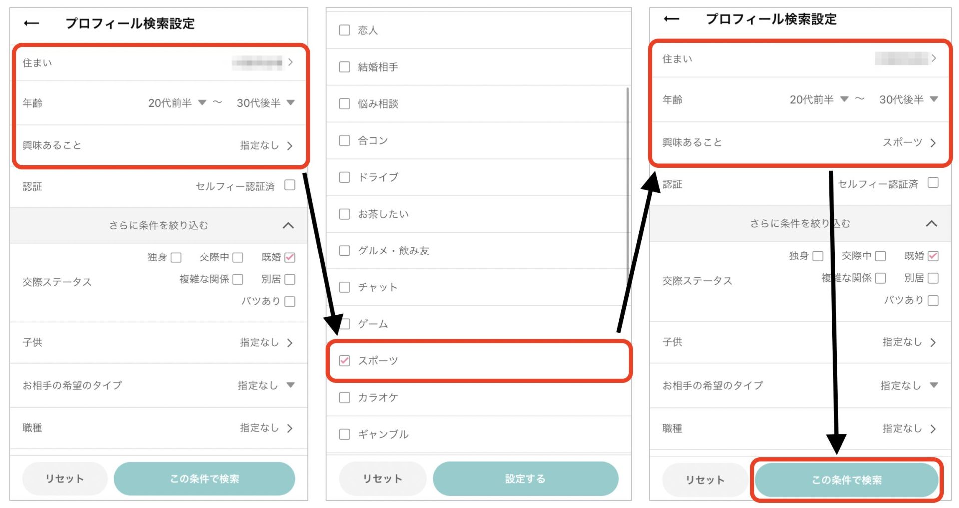 既婚者でも利用できる大手マッチングアプリでのスポーツを一緒にしたり観戦したりする異性の友達の探し方について図解で紹介してきました。