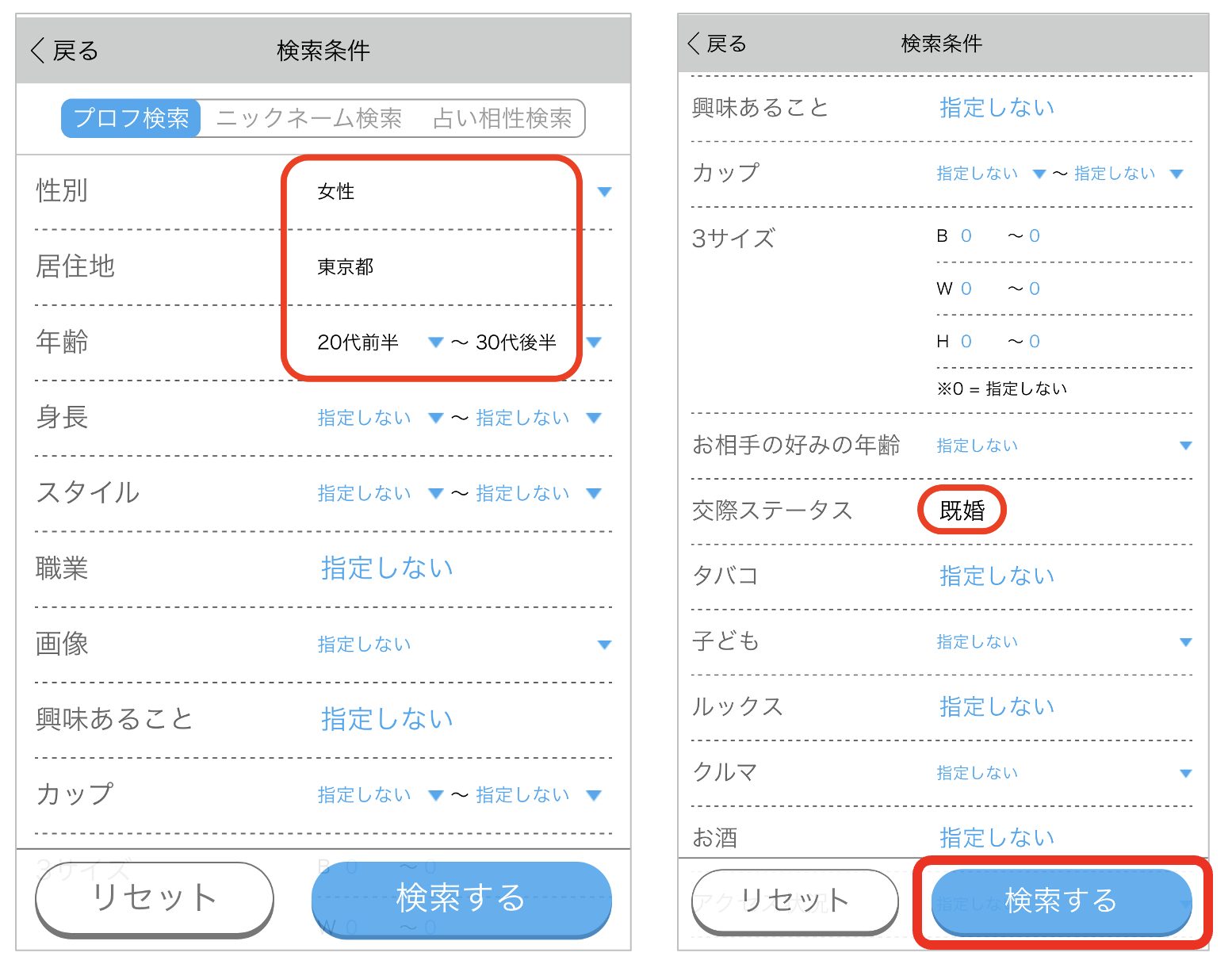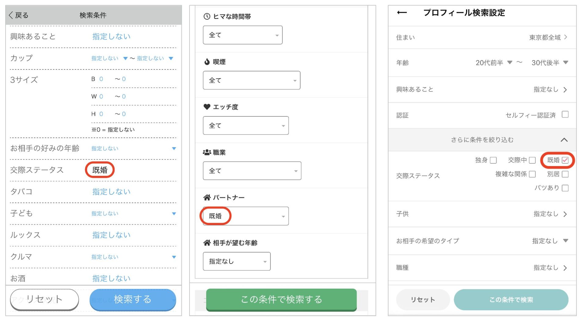 既婚者でも利用できる大手のマッチングアプリでは、検索の機能の中に、『既婚者』を絞り込んで選ぶことができる機能が標準装備されています。