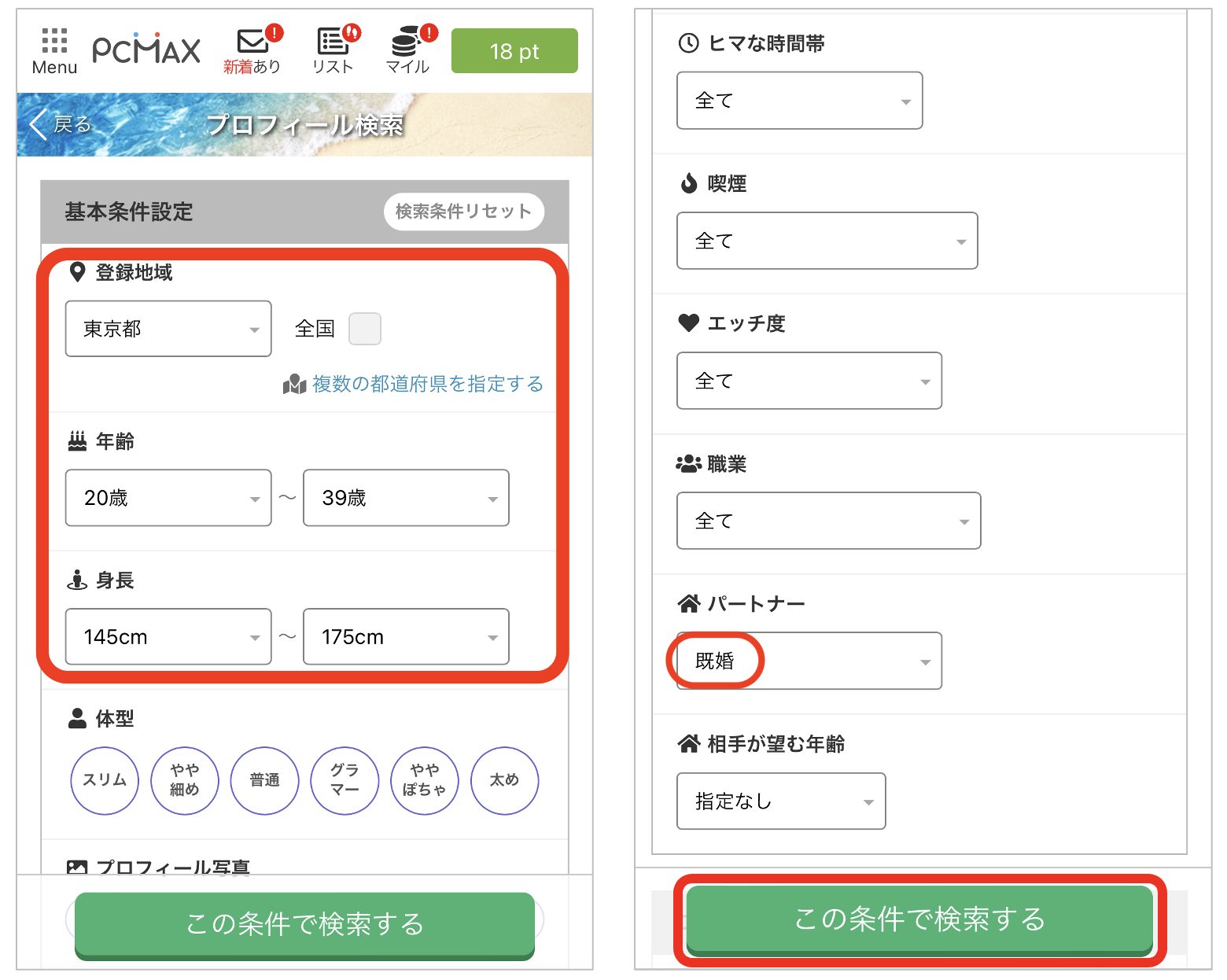 PCMAXのプロフ検索画面で、登録地域(東京都)、年齢(20歳〜39歳)、身長(145cm〜175cm)、パートナー(既婚)の条件のみを選択して検索してみました。