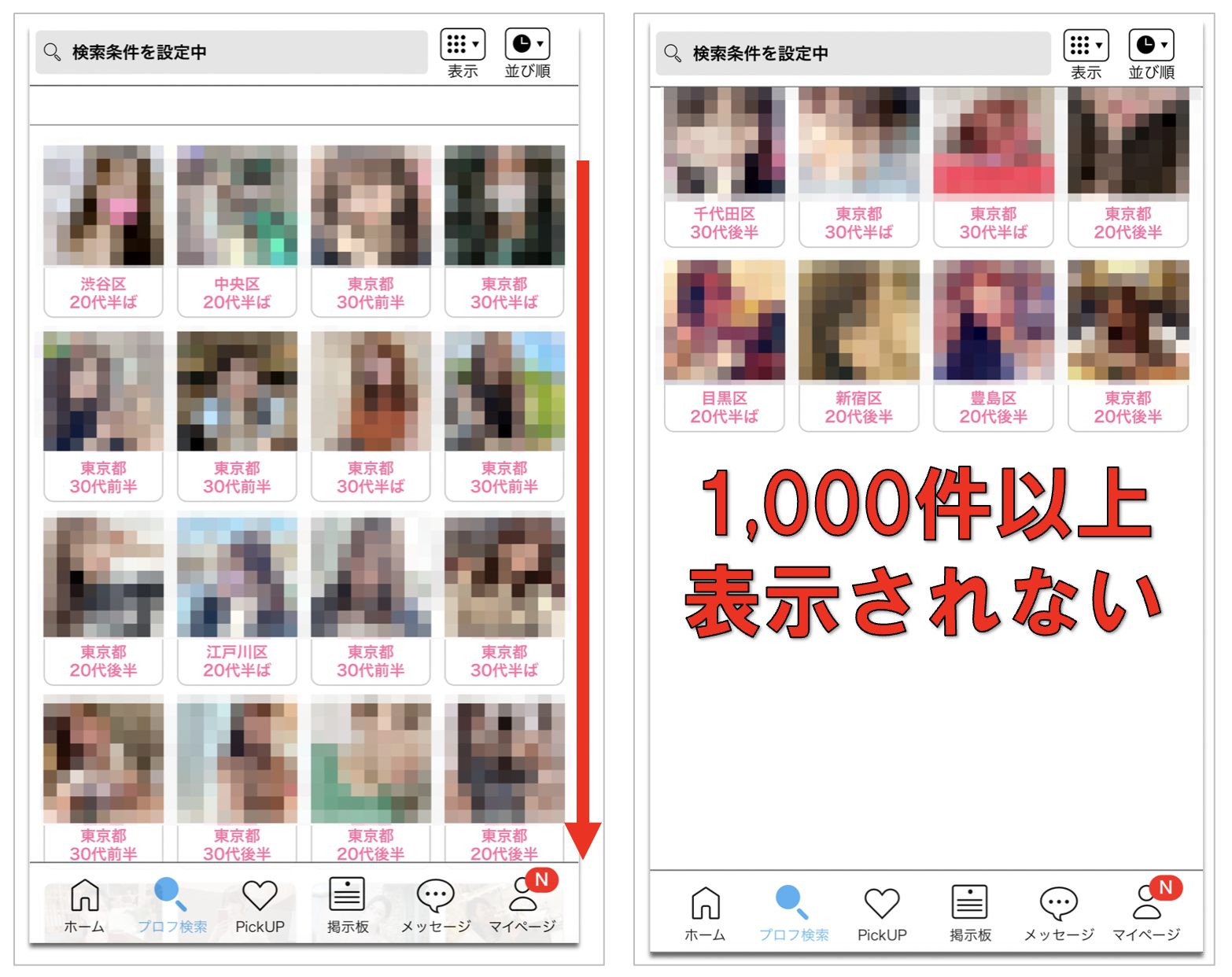 ずっと下にスクロールして、全部で何件あるかをカウントすると、ハッピーメールもピッタリの1,000件でした。