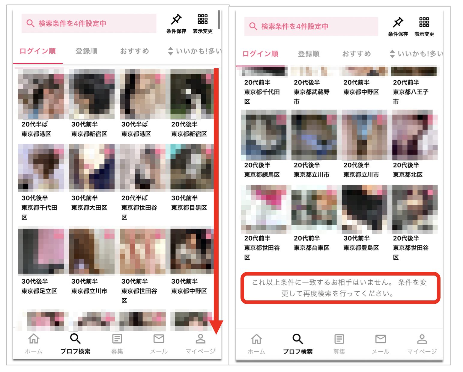 ハッピーメールのプロフ検索画面で、先程と同じ条件で、居住地(東京)、年齢(20代前半〜30代後半)、交際ステータス(既婚)の条件のみを選択して検索してみました。