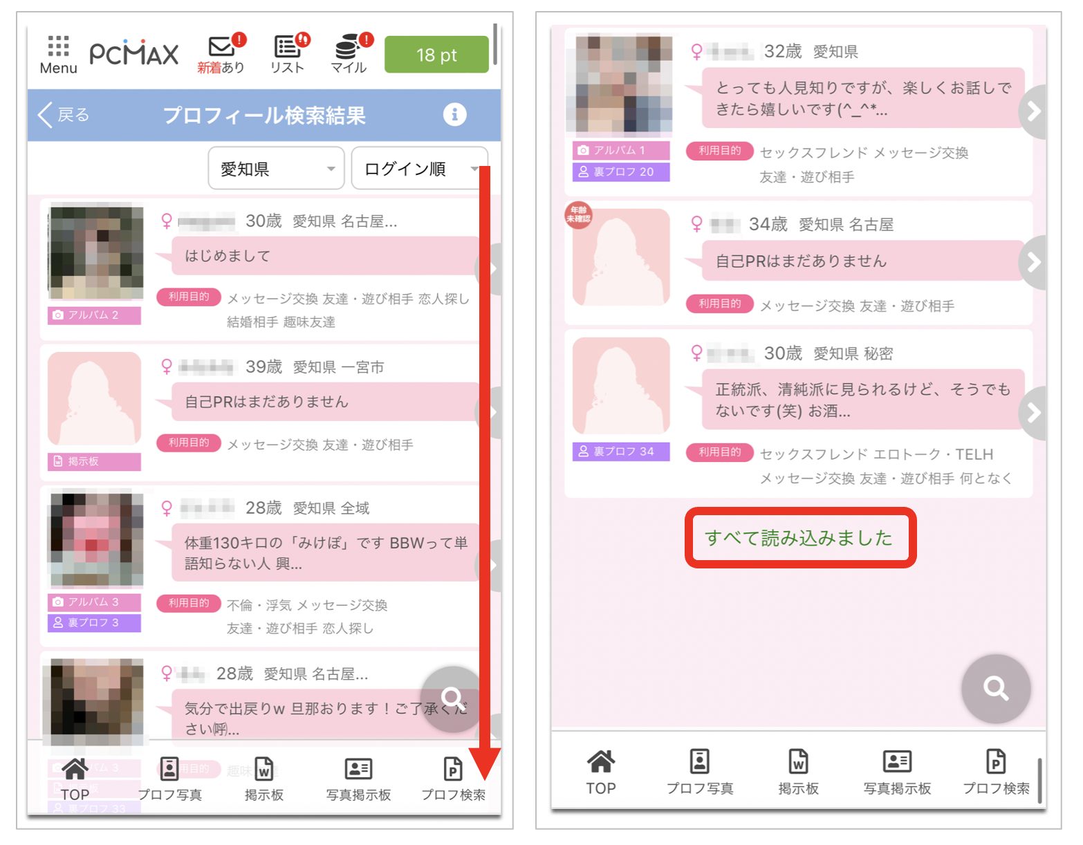 同様に愛知に在住の既婚者のPCMAXの利用者のリストが表示されます。