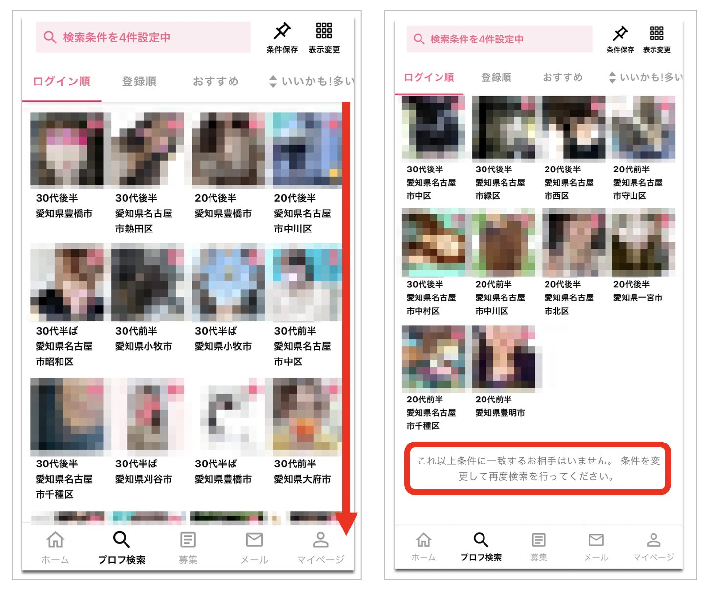 ワクワクメールのプロフ検索画面で、同じ条件で、住まい(愛知県全体)、年齢(20代前半〜30代後半)、交際ステータス(既婚)の条件のみを選択して検索してみました。