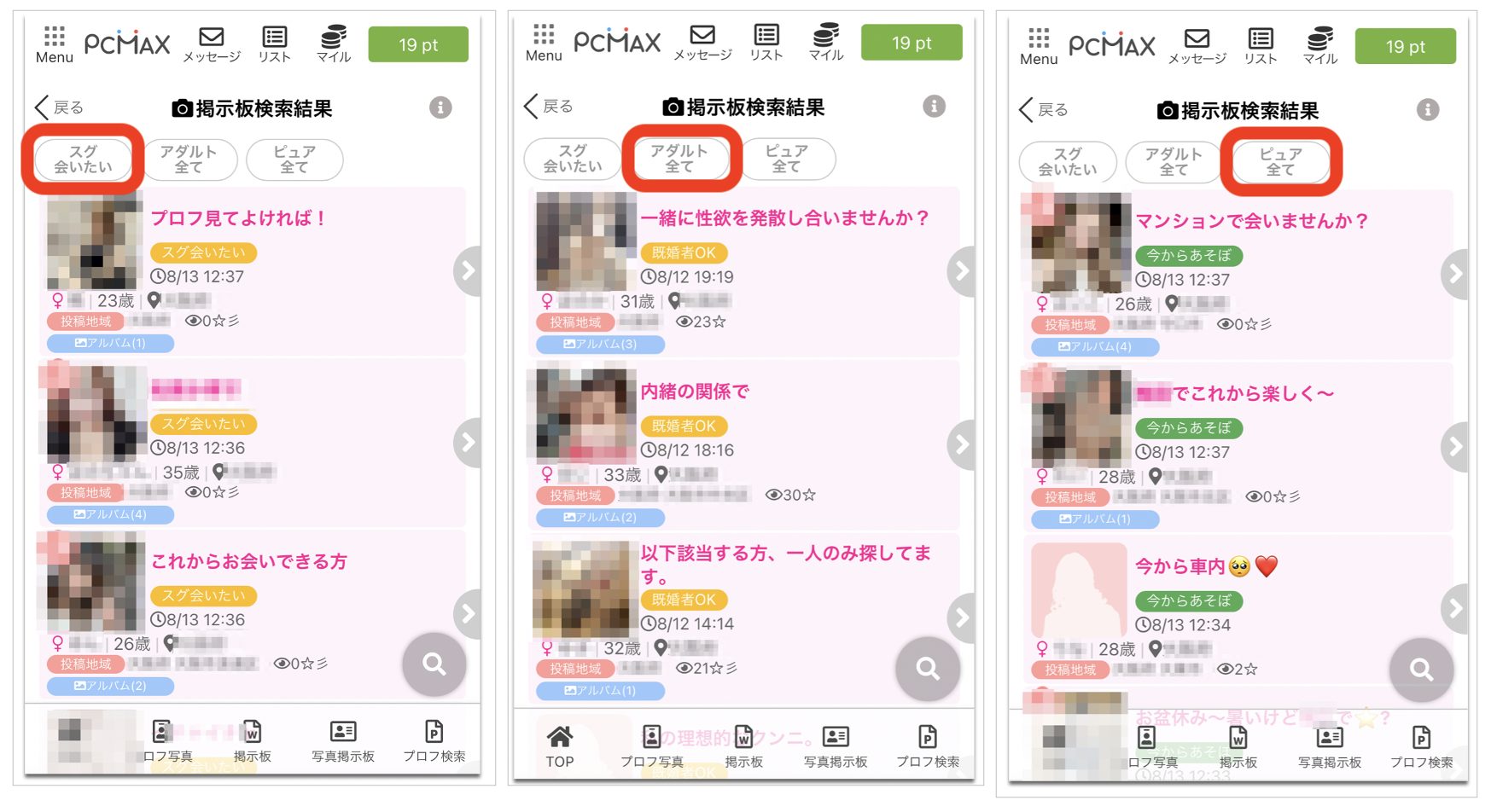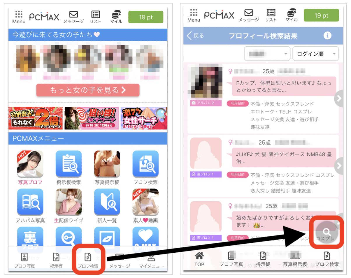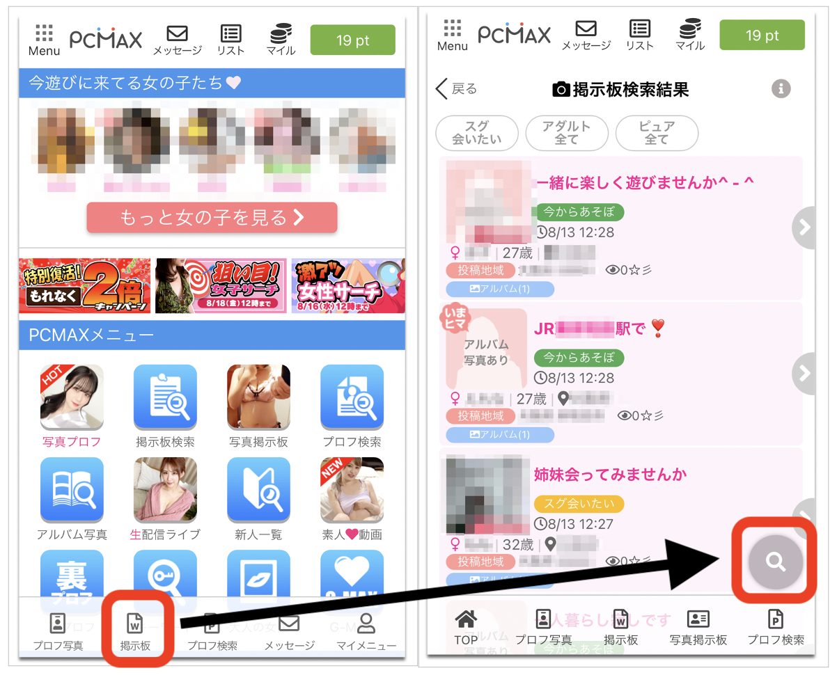 PCMAXでの検索方法には、『掲示板(検索)』と『プロフ検索』の2つがあります。