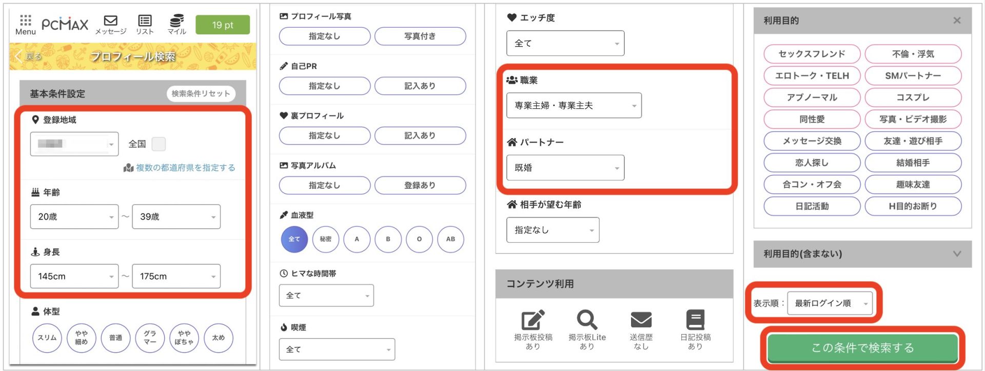 ここでの検索設定項目数は、16個ありますが、ここでは『登録地域』『年齢(20歳〜39歳)』『身長(145cm〜175cm)』『職業(専業主婦)』『パートナー(既婚)』の5つの項目を設定し検索します。