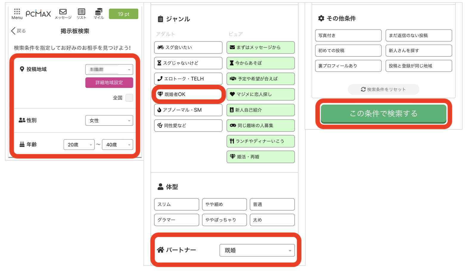 今回は、『投稿地域』『性別(女性)』『年齢(20歳〜40歳)』『ジャンル(既婚者OK)』『パートナー(既婚)』の5つの項目を設定して検索します。